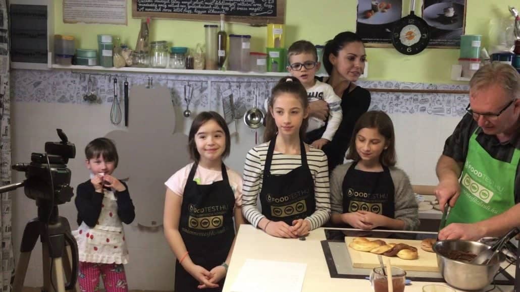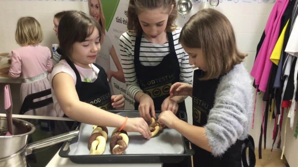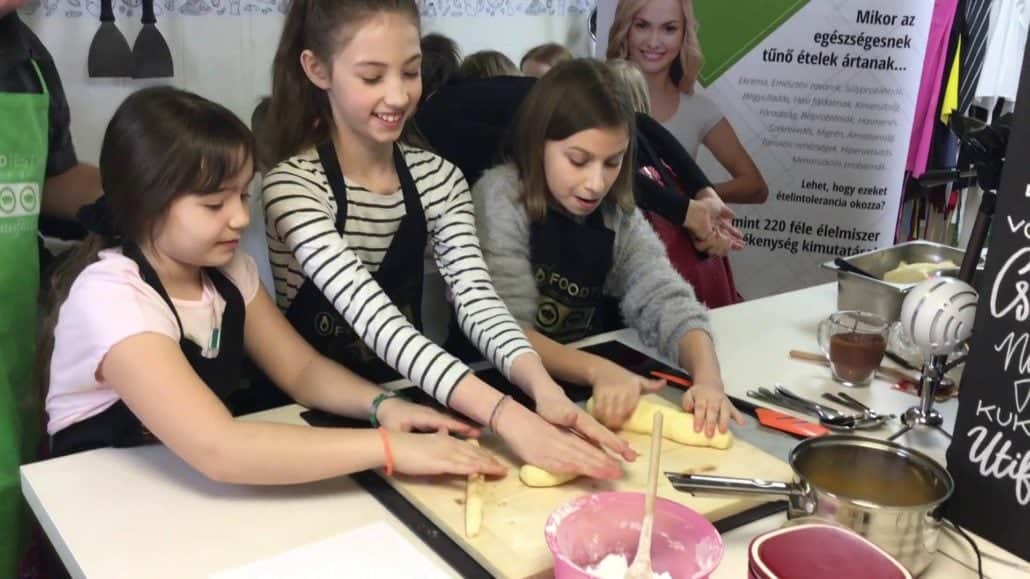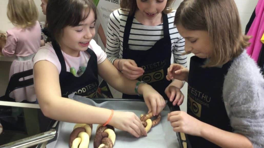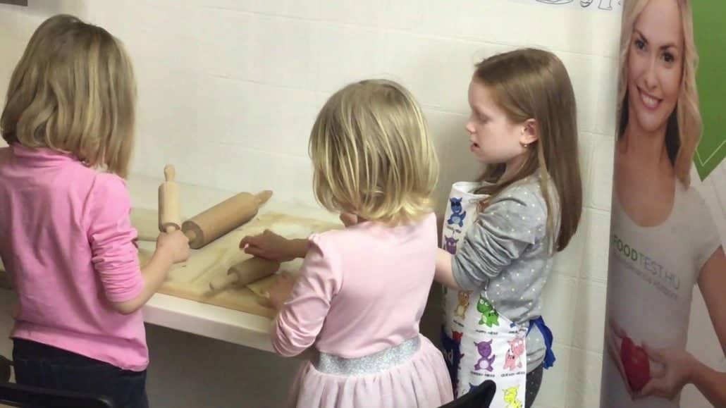 A gyerekek beleteszik a hozzávalókat az edénybe. Attila elmondja, hogy, ha valaki nem ehet élesztőt, akkor szódabikarbónát vagy sütőport lehet helyette használni, de fontos, hogy gluténérzékenység esetén gluténmentes sütőpor legyen. A tésztába kell még margarin vagy vaj is, de aki nem ehet tejet, annak a laktózmentes (tejfehérjementes) margarin javasolt. A margarint meg kell olvasztanunk, de langyosra hűtsük vissza és úgy tegyük a tésztába elmondta Attila. Megnézhetjük az ipari dagasztógép működését is. Ha nincs ipari dagasztógépünk 25-30 percig kell dagasztanunk a tésztát. A tésztát csíkokra vágjuk és gyúrunk belőle hosszú rudakat, amikből később megfonjuk a kalácsot. A gyerekek lelkesen gyúrták a tésztát. A tésztánkat színezhetjük kakaóval és ízesíthetjük vaníliás cukorral is. Anita elmeséli, hogy gyerekként a húsvétot a keresztanyukájánál töltötte Nagykovácsiban, ahol a régi szokások szerint a locsolók házról házra jártak és locsolták a lányokat és rengeteg piros tojást festett Anita.