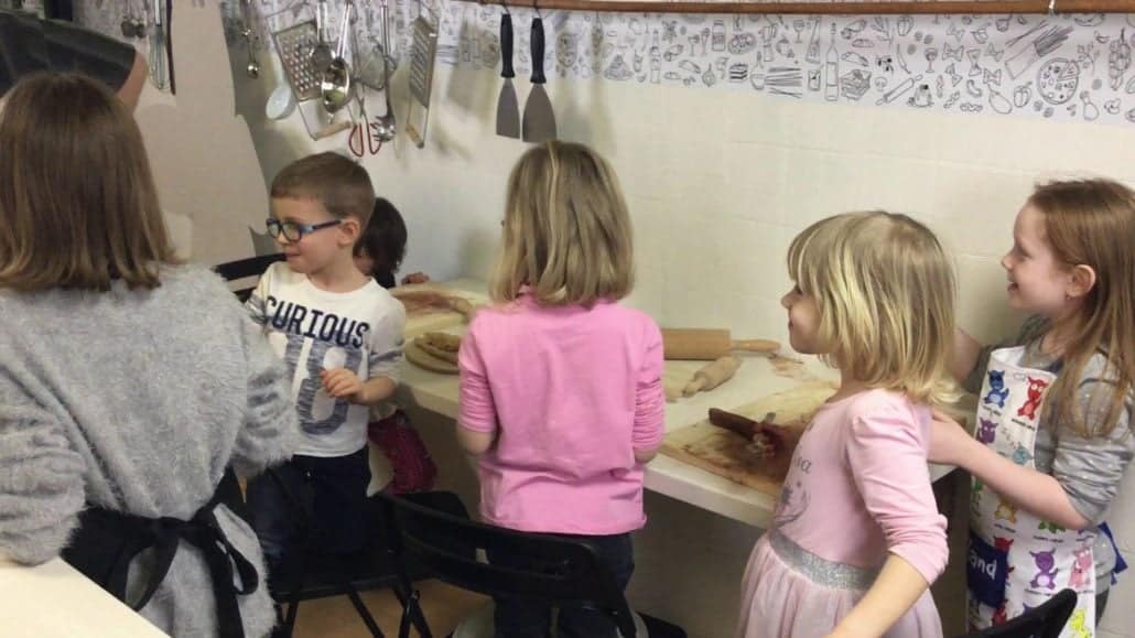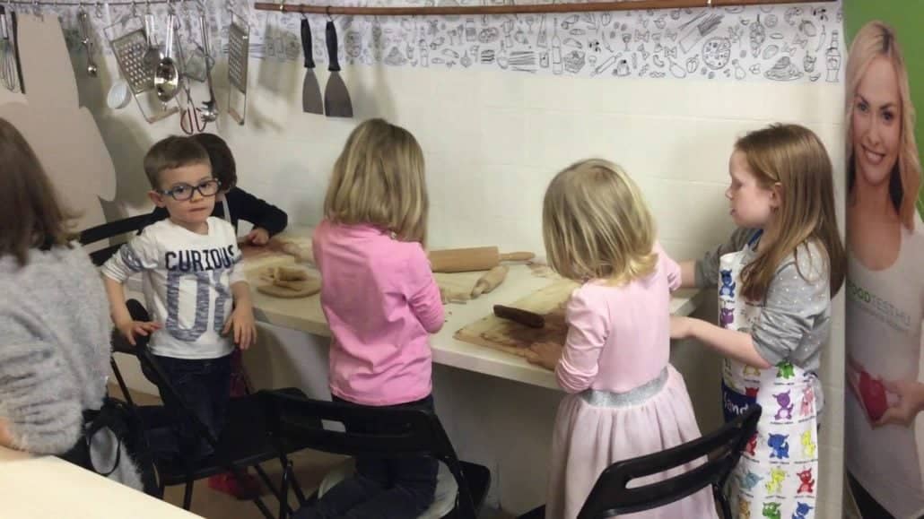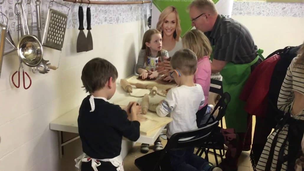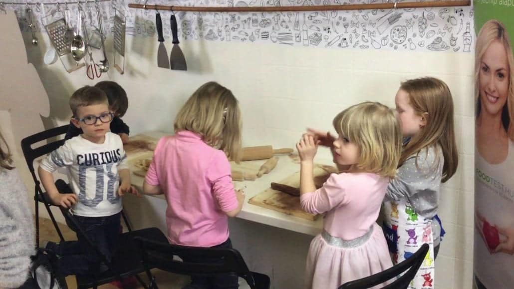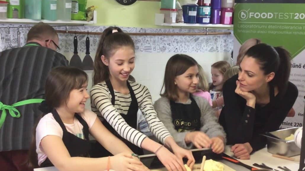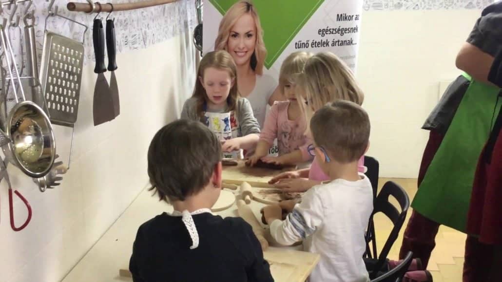 A gyerekek beleteszik a hozzávalókat az edénybe. Attila elmondja, hogy, ha valaki nem ehet élesztőt, akkor szódabikarbónát vagy sütőport lehet helyette használni, de fontos, hogy gluténérzékenység esetén gluténmentes sütőpor legyen. A tésztába kell még margarin vagy vaj is, de aki nem ehet tejet, annak a laktózmentes (tejfehérjementes) margarin javasolt. A margarint meg kell olvasztanunk, de langyosra hűtsük vissza és úgy tegyük a tésztába elmondta Attila. Megnézhetjük az ipari dagasztógép működését is. Ha nincs ipari dagasztógépünk 25-30 percig kell dagasztanunk a tésztát. A tésztát csíkokra vágjuk és gyúrunk belőle hosszú rudakat, amikből később megfonjuk a kalácsot. A gyerekek lelkesen gyúrták a tésztát. A tésztánkat színezhetjük kakaóval és ízesíthetjük vaníliás cukorral is. Anita elmeséli, hogy gyerekként a húsvétot a keresztanyukájánál töltötte Nagykovácsiban, ahol a régi szokások szerint a locsolók házról házra jártak és locsolták a lányokat és rengeteg piros tojást festett Anita.