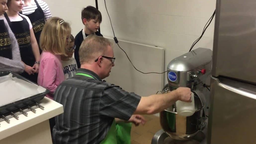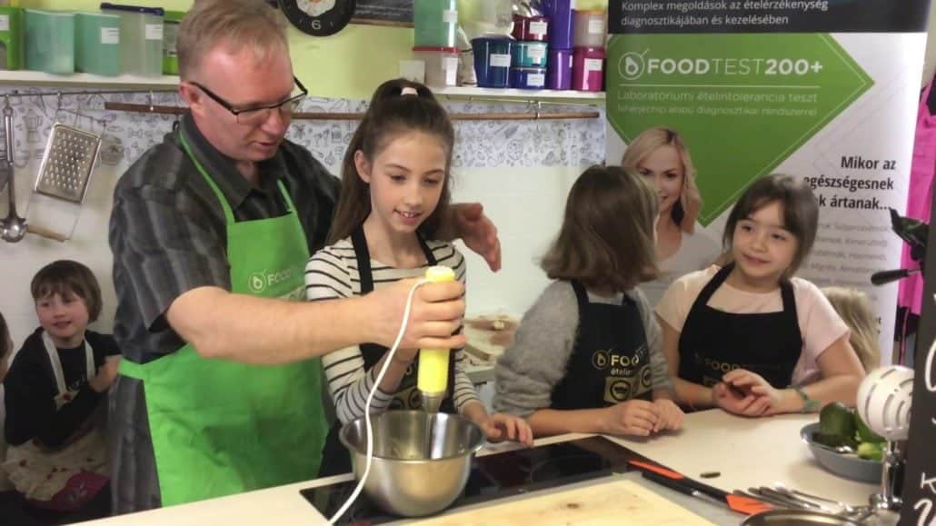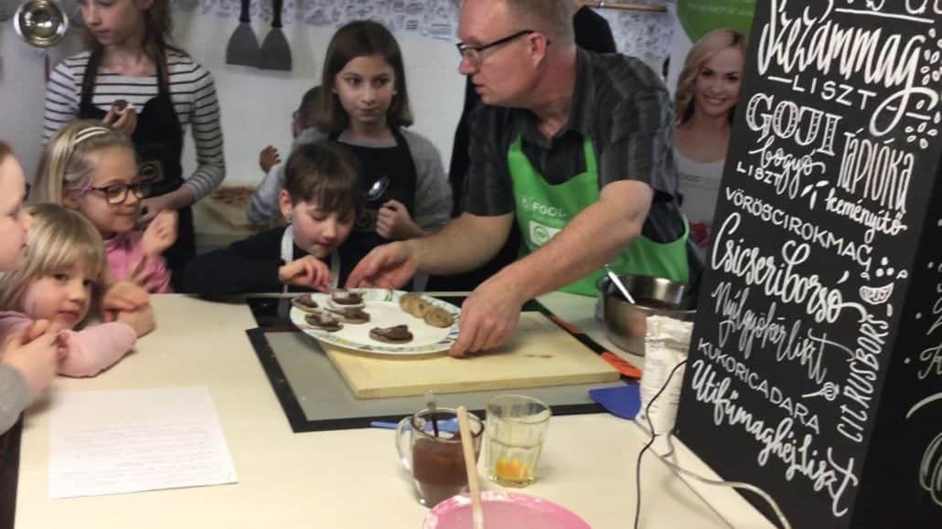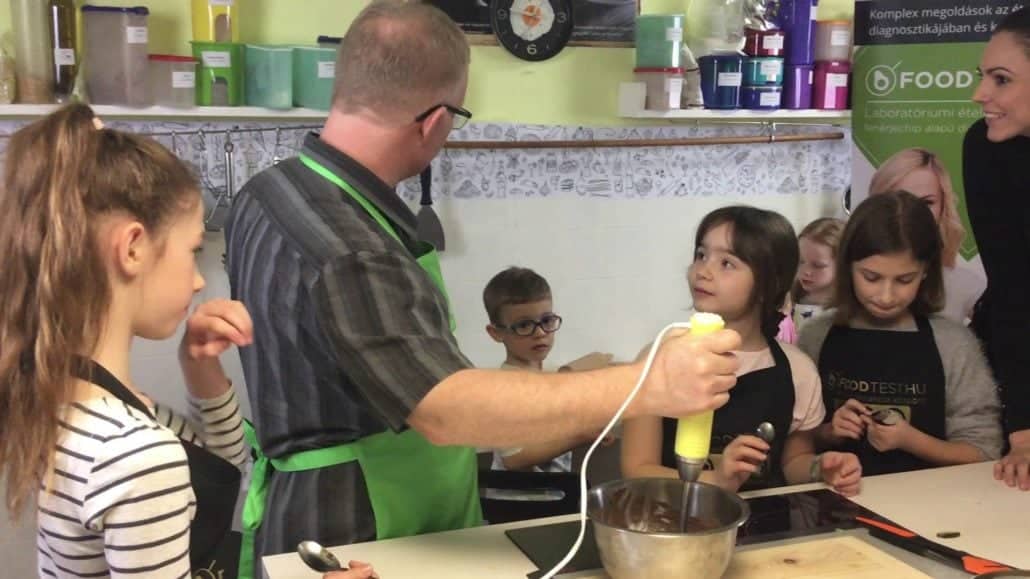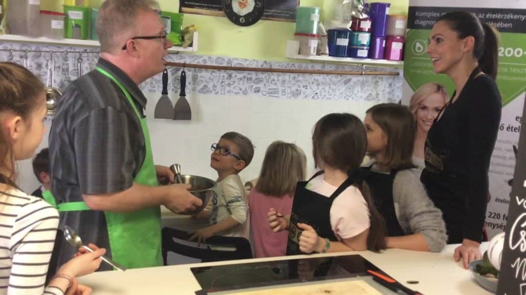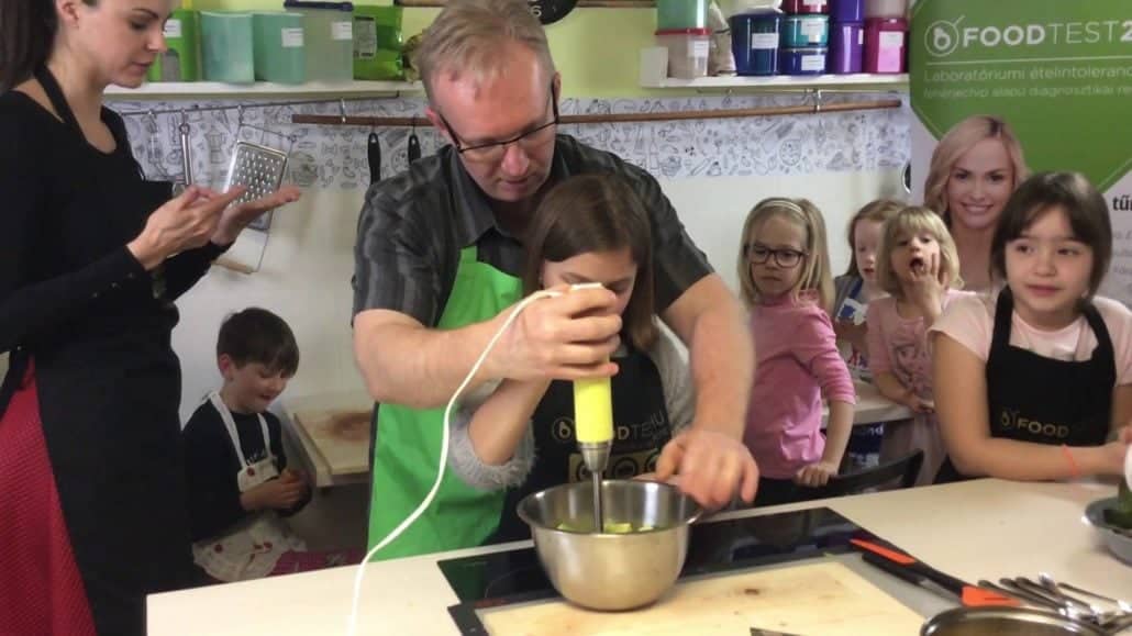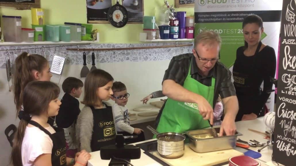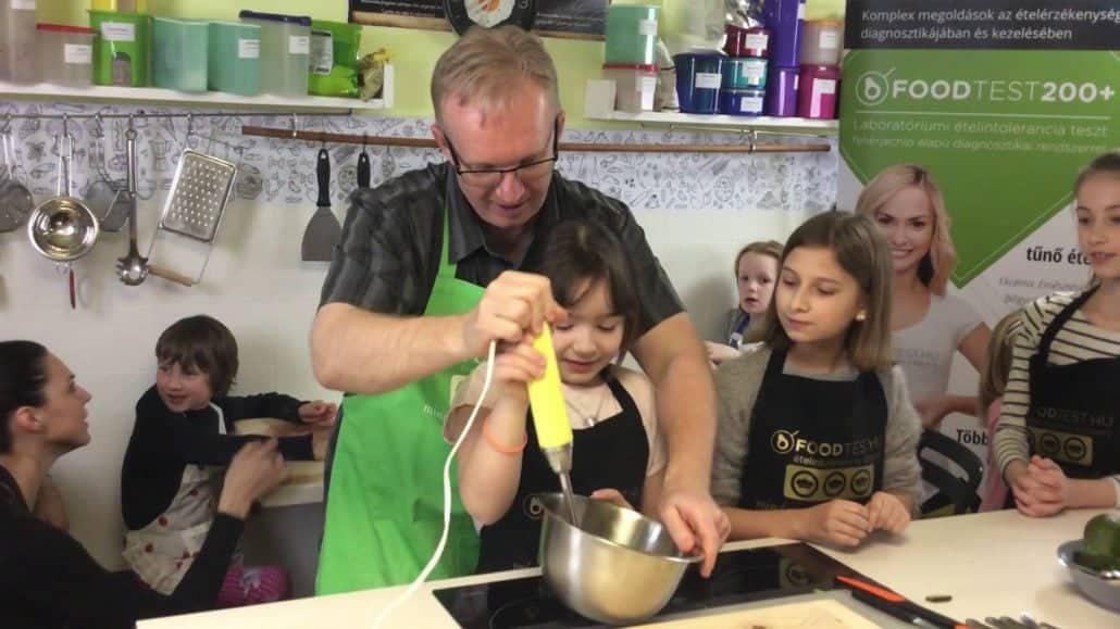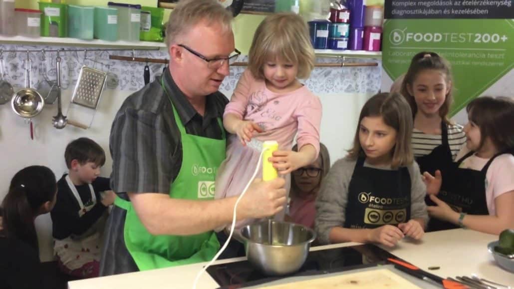 Attila megmutatja a gyerekeknek, hogy milyen mentes tésztával fognak dolgozni. Elmondja, hogy a kalácsba kell egy pici só, sütőpor, édesítő (xilit, stevia), tojássárgája, víz vagy növényi tejhelyettesítő, a gyerekek sorolják, hogy milyen tejhelyettesítőket ismernek ? (rizs, kókusz, mandula, kesudió, zab).